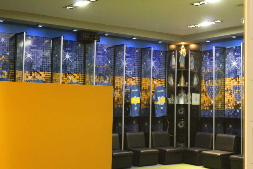 Com o fim do tour no gramado, visitamos ainda o vestiário do Boca (que é lindo, por sinal, todo azul e amarelo e com pequenas mordomias) e o do time adversário, bem mais simples.