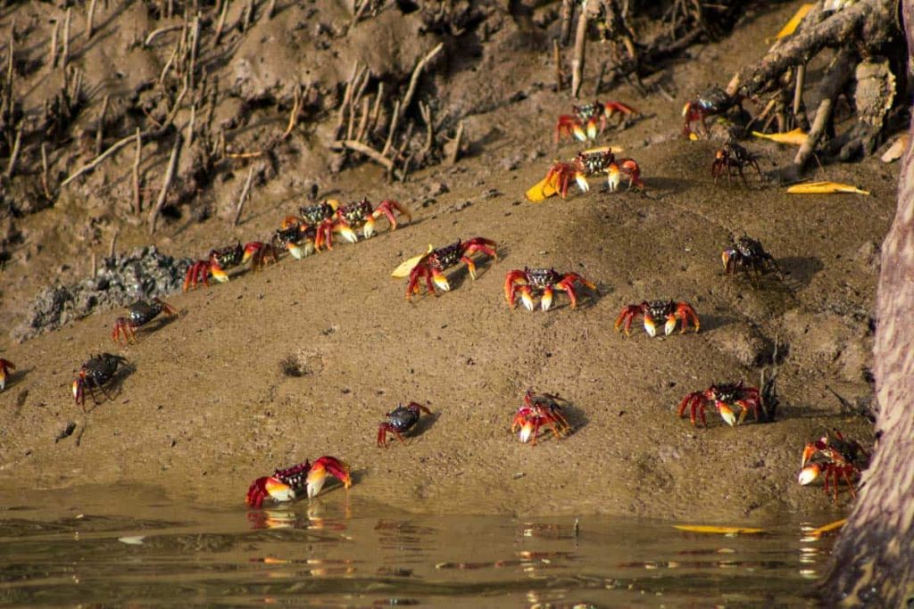 Aqui e ali, começaram a aparecer os caranguejos bem vermelhos, constrastando com o manguezal. Nossos guias procuraram até achar uma clareira grande o suficiente para encostarmos os barcos.