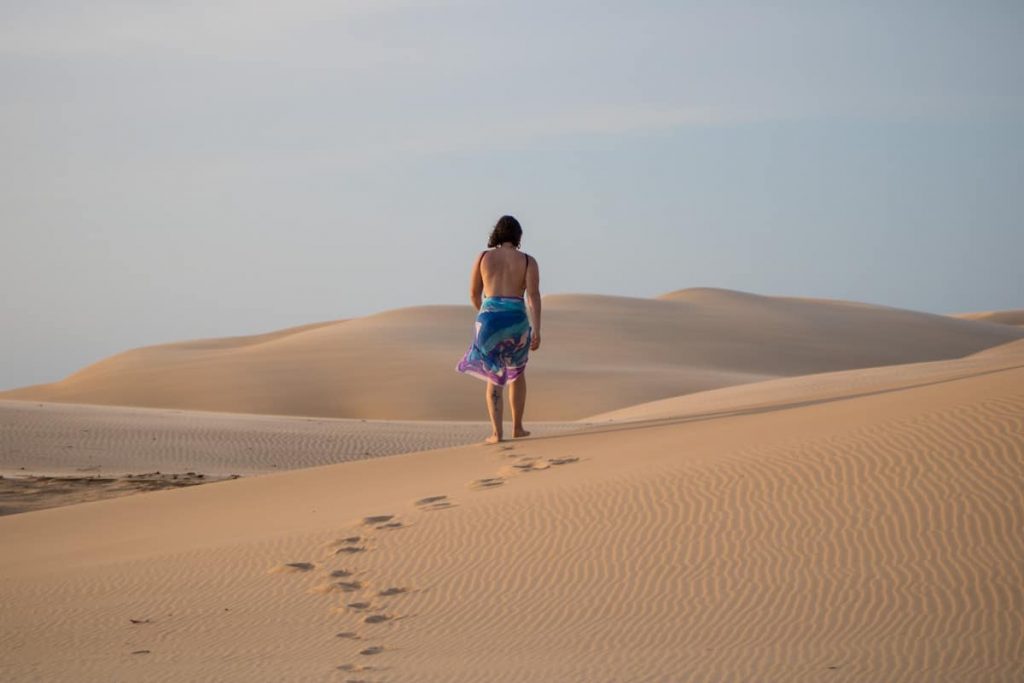 Ao lado do rio, uma enorme duna de areias brancas se levantava, dando um constraste surreal para a paisagem. Cheguei a subir na duna para conferir a vista lá de cima.